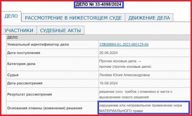 Как следует из апелляционного Постановления Омского областного суда по делу №33-4098/2024 от 16 августа 2024 года (см. https://oblsud--oms.sudrf.ru/modules.php?name=sud_delo&name_op=doc&number=27250134&delo_id=5&new=5&text_number=1&srv_num=1), суд первой инстанции (председательствующая судья Руф О.А.) в деле не разобрался.