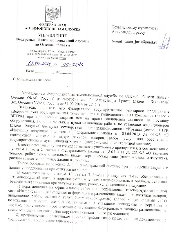 Еще одна реакция «заинтересованного ведомства» состоялась на нашу публикацию «Омский «Народный фронт» переформатируют на контроль за госзакупками и тендерами» http://omsk-pravo.ru/index.php?option=com_content&view=article&id=1412:-l-r-&catid=185:astashkin