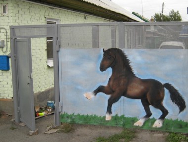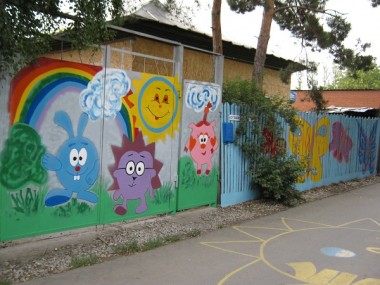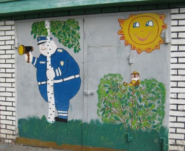Всё асфальтовое покрытие на протяжении двадцати дворов превратилось в увлекательный детский лабиринт из «классиков», «змеек», «ручейков» и «солнышек». Обычные заборы, калитки и гаражные боксы превратились в яркие образцы «наскальной живописи». Почти у каждого дома –