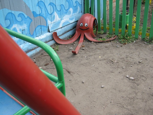 А еще в зарослях яблони-дички спряталась пушкинская русалка, а папы, воодушевленные энтузиазмом своих отпрысков, тряхнули стариной, соорудив мини спортплощадку и вырезав из дерева, покрышек и иного подручного материала увлекательные фигуры зверей и птиц.