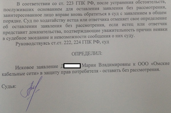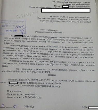Учитывая, что после общения с коллекторами из ООО "Служба взысканий" смс-домогательства не прекратились, девушка решила подать на «Омские кабельные сети» в суд. Что и сделала.
