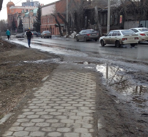 Увернуться от грязных брызг из-под машин и не поскользнуться на размытом грунте! Или не угодить каблуком в люк ливневой канализации! Или не свалиться в овраг старинного речного русла!