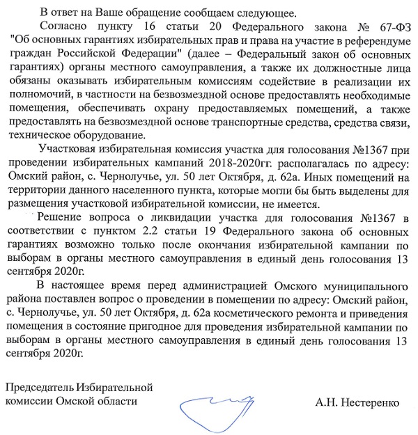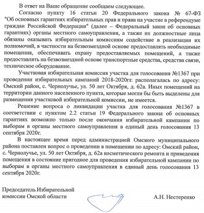 Во-первых, ответственность за размещение команды УИК по конкретным помещениям и адресам – это прерогатива и полномочия местных администраций (исполнительных органов власти). В нашем случае, понятно, что за печальный инцидент с участком №1367 несет администрация Омского района и лично его глава,