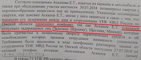 По словам Аскапова, три последних его задержания наркосбытчиков Залетиной (Щукиной), Щеглова и Миккера «вызвали негодование со стороны Управления наркополиции и Службы собственной безопасности УМВД». Последние звонки с предложением «забыть про этих наркодилеров» и «перестать под них копать» поступили ему на телефон 27-го июля, то есть, за два дня до его задержания. Он отказался.