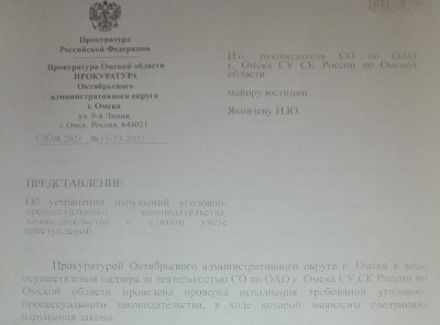 В адрес и.о. руководителя окружного подразделения СКР прокурором Октябрьского АО внесено представление "об устранении нарушений уголовно-процессуального законодательства, законодательства о едином учете преступлений".