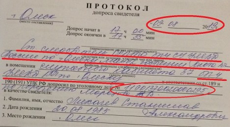 Вот он требует от СКР и Прокуратуры «привлечь к уголовной ответственности опера из ОП-5 Бектурсунова!», который на заседании суда поменял свои прежние показания. А на следствии опер со стажем вдруг «забыл», как правильно завизировать протокол своего собственного допроса.