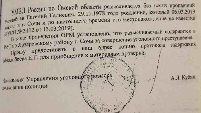Наоборот, из Омска пришло розыскное дело, что, якобы, гражданин Е.Т.Молдобаев просто «без вести пропал» и его безуспешно ищут