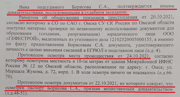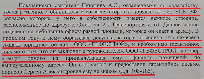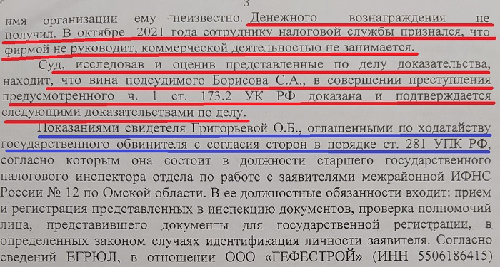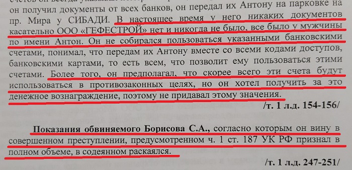 Да, там где-то внутри уголовного дела мелькает информация, что никаких действий кроме передачи паспорта неизвестному и получения учредительных документов на ООО «ГЕФЕСТРОЙ» инвалид не совершал. Удостоверение личности Борисов передал некоему Антону по просьбе своей Интернет-знакомой Ольги из Крутинки (девушка давила на то, что знакомы с Сергеем были еще по Кировской школе-интернату).