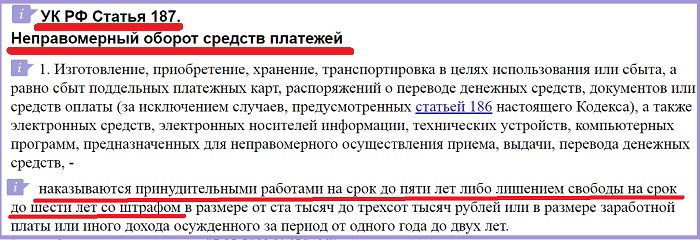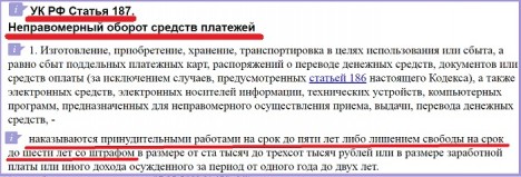 В основном уг/деле фигуранту инкриминируют уже другой состав преступления – по ч.1 ст.187 УК РФ (это «изготовление в целях сбыта или сбыт поддельных кредитных либо расчетных карт, а также иных платежных документов, не являющихся ценными бумагами»).