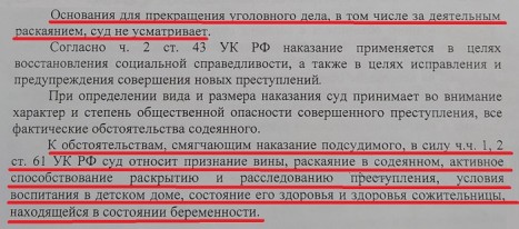 Судья Калашникова, на мой взгляд, осознавала общественно опасный характер своего человеческого равнодушия и профессиональной халатности, когда относила к смягчающим вину обстоятельствам (ст.61 УК РФ) «признание вины» (которой нет-!), «раскаяние в содеянном» (а есть ли в деле доказательство, что «преступник» понимает или осознает, что совершил-?!), «условия воспитания в детском доме» (это не «детский дом», а два специализированных медучреждения для умственно отсталых детей-!!!), «состояние его здоровья» (чем подтверждено? Где в приговоре ссылка на ст.22 УПК РФ, где результаты Комплексной судебной психолого-психиатрической экспертизы-?????).