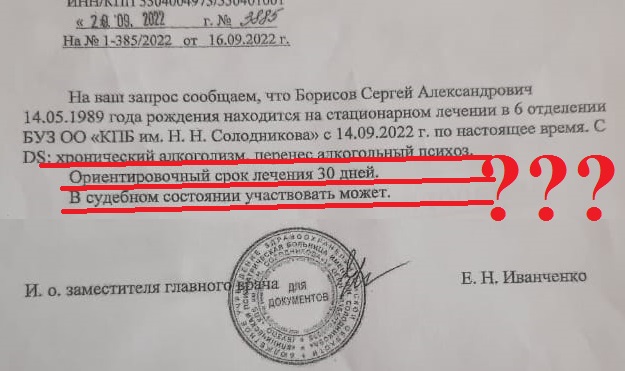 Она предложила приостановить рассмотрение уголовного дела в отношении гр. Борисова С.А. на том основании, что тот два раза подряд был госпитализирован в медучреждения. На этот раз в БУЗОО «Омская клиническая психиатрическая больница имени Н.Н.Солодникова».