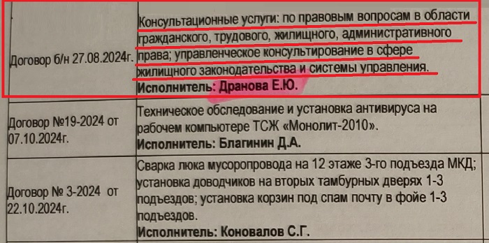 В документах ТСЖ «Монолит-2010», которые, видимо, весьма поверхностно были изучены силовиками из городского ОБЭП, именно гражданка Драпова указана как… «консультант» (!) Товарищества по… «правовым и иным вопросам»!!!